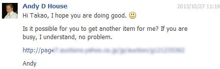 私の場合、毎回、Hello, my friend Takao!と海外の方からメッセージを頂くと、とても嬉しくて、イーベイやっていて良かったなと思います。
