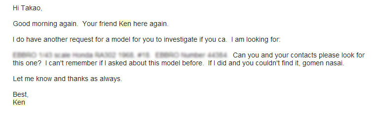 Kenもアメリカ人で、日本の車の模型が大好きです。今回も4台の注文を頂きました。Kenとはレッドソックスの話題で盛り上がっています。今年大活躍した上原のファンだそうです。