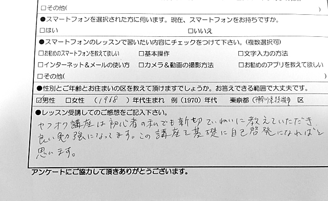 「ヤフオク講座は初心者の私でも親切ていねいに教えていただき、良い勉強になっています。この講座を基礎に自己啓発になればと思います。」